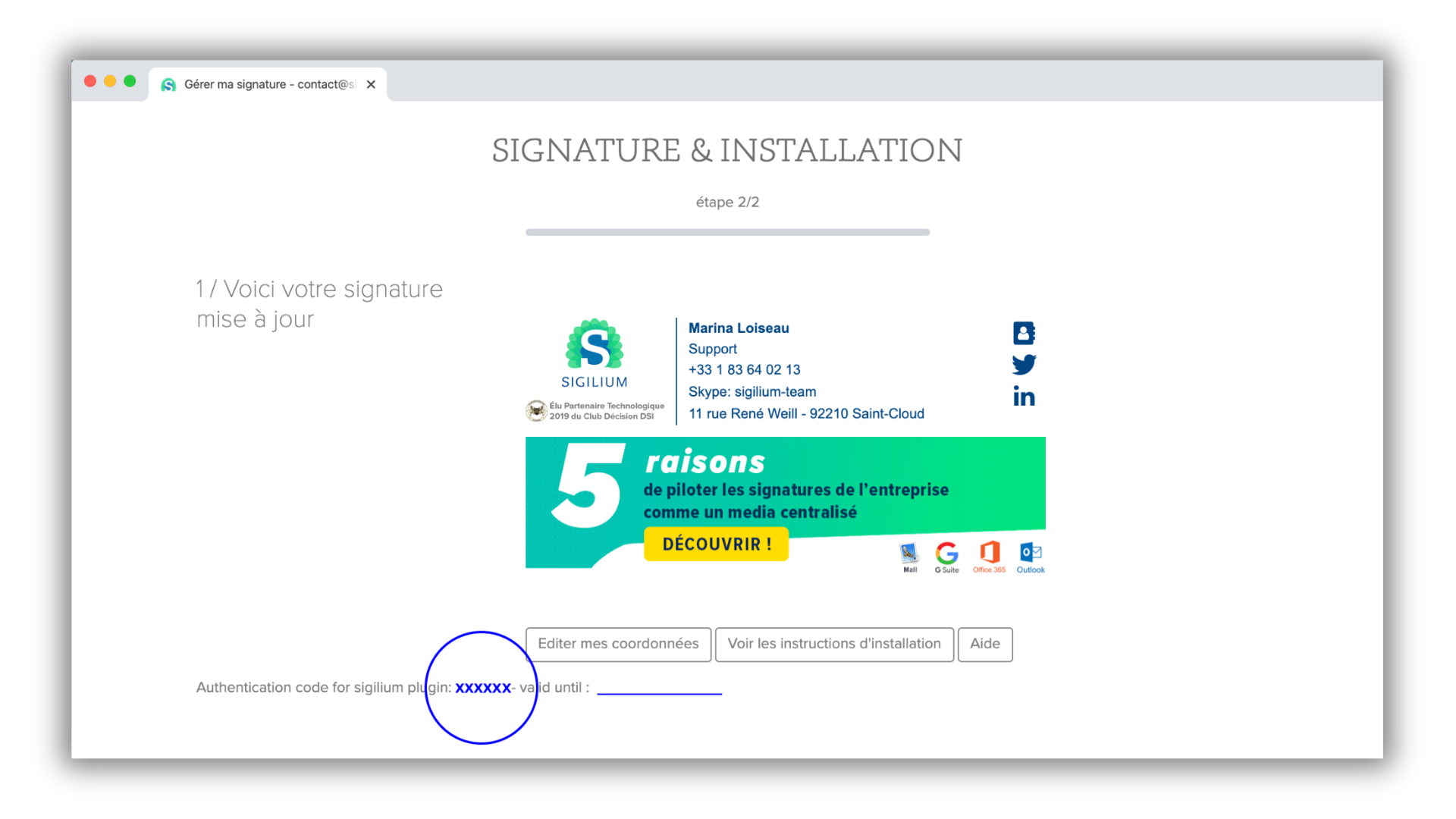 Dans votre espace sur le site de Sigilium, en dessous de votre signature, figure le code d'authentification composé de 6 chiffres.