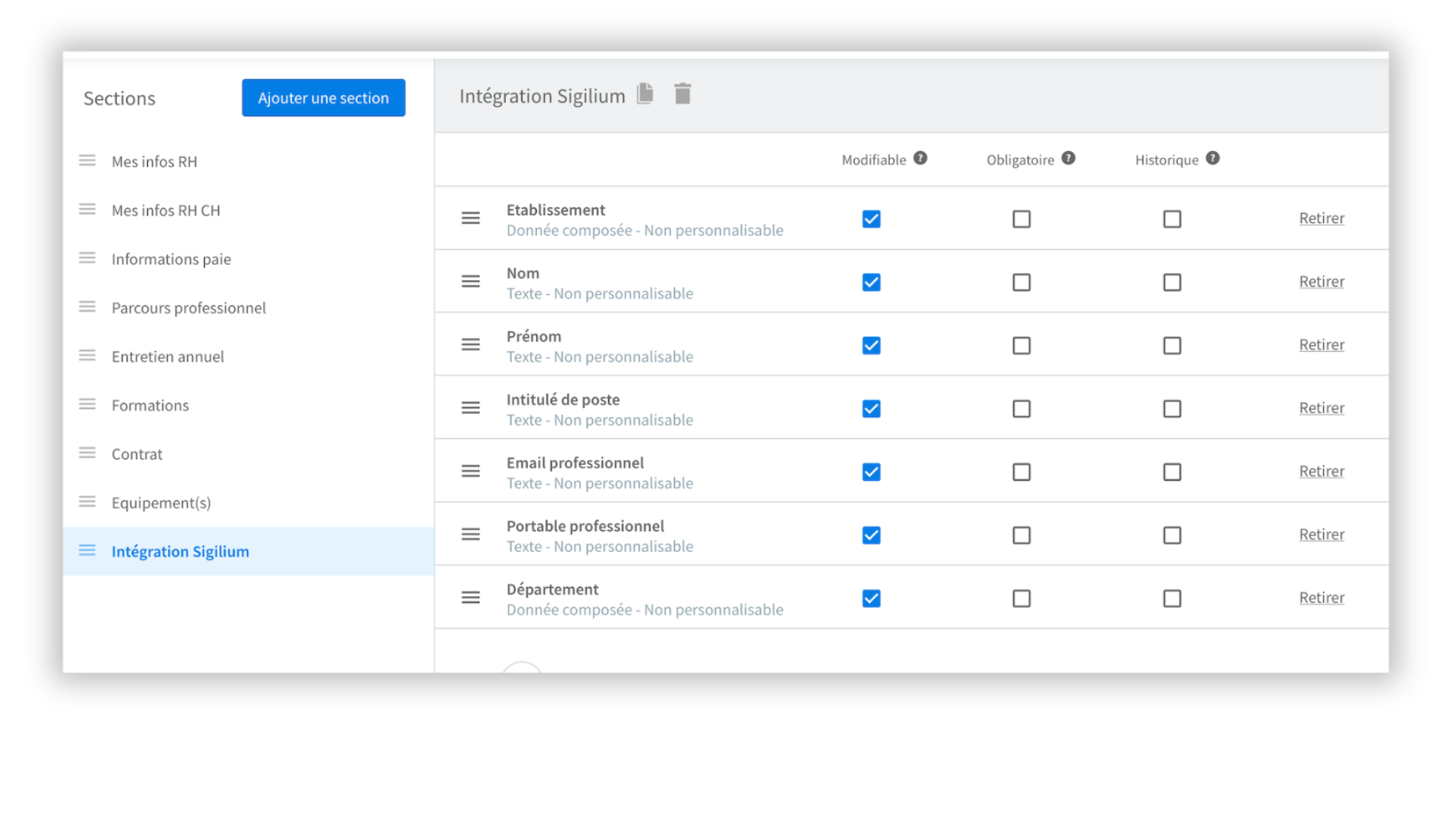 • Et sélectionnez uniquement les champs nécessaires à l'intégration avec Sigilium