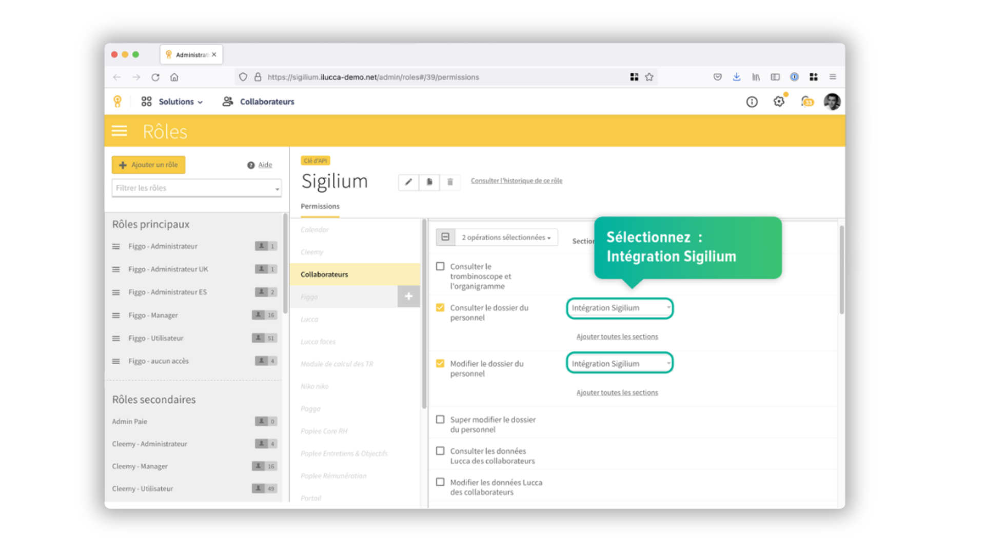 5 - Sélectionnez le rôle "Consulter le dossier du personnel" et choisissez "Intégration Sigilium".