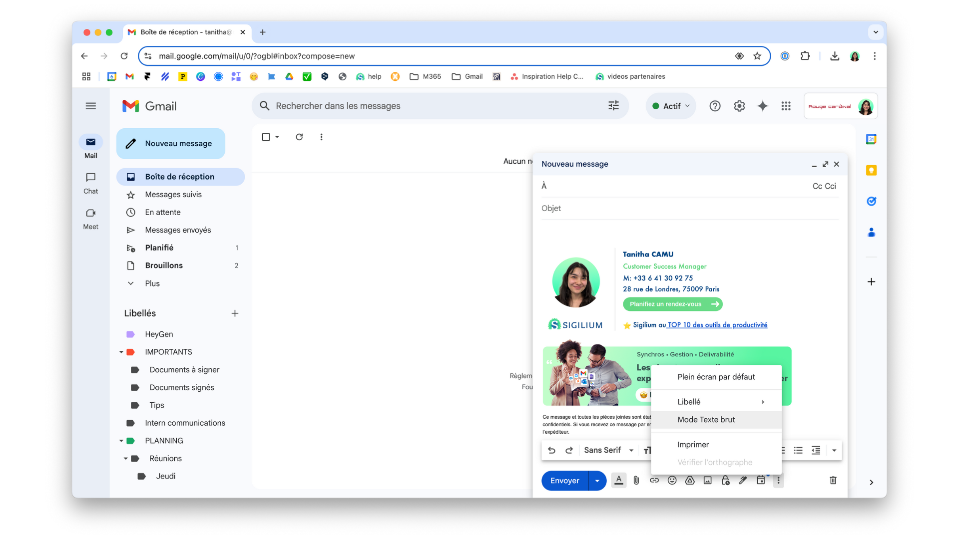 Si votre signature n'apparait pas correctement dans Gmail , il se peut que le message que vous êtes en train d'écrire est au format texte.